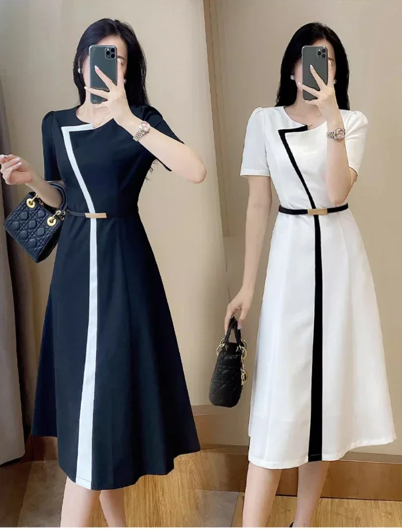 Elegant Color Blocking Vintage Midi Dresses for Women 2025 Summer New Office Lady Simple Big Swing A-line Casual Party Vestidos