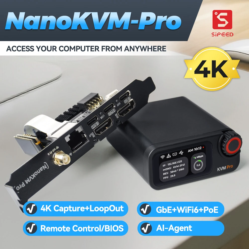 Sipeed NanoKVM-Pro PiKVM 4K IP-KVM GbE WiFi6 PoE Remote Control HomeLab Server NAS AI Agent HDMI second screen led strip