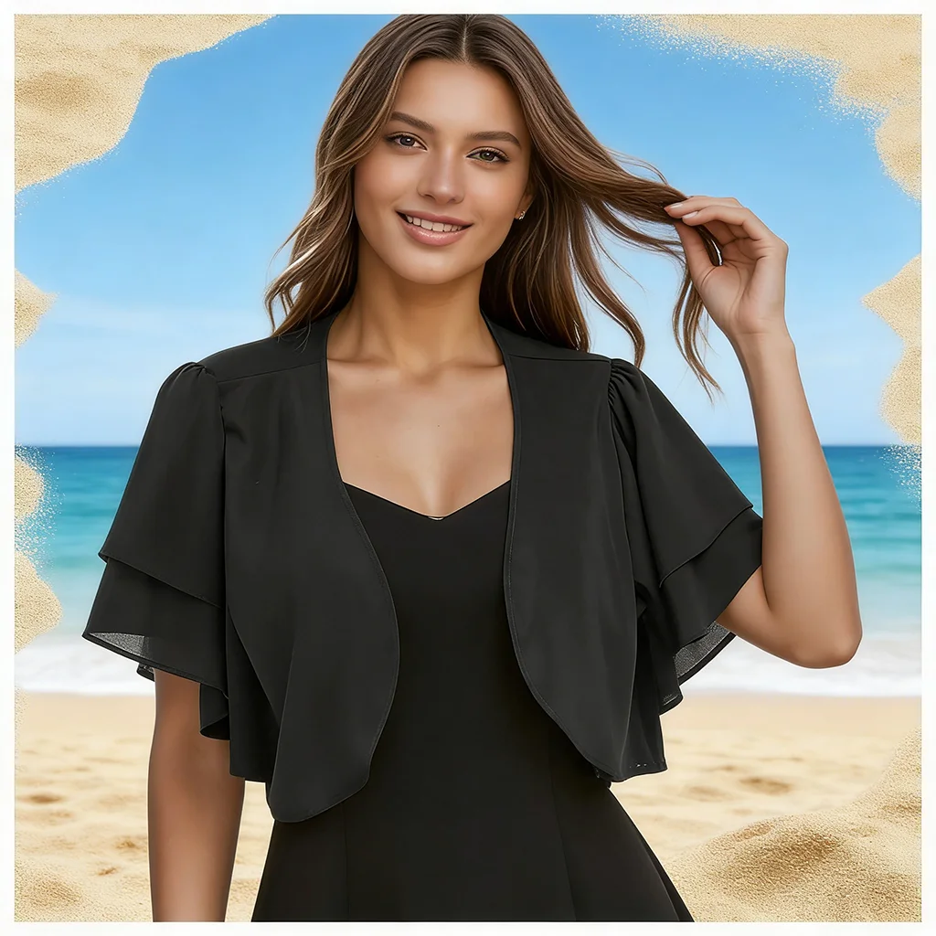 Lady's summer chiffon wide shoulder strap open-knit sweater, an elegant short-sleeved open-style lightweight transparent short