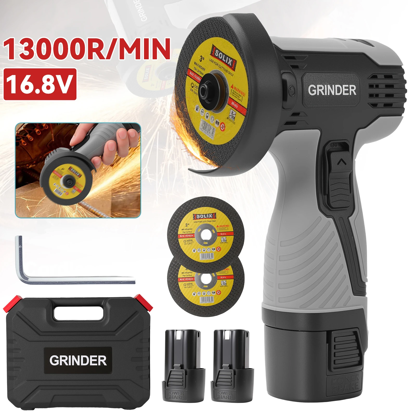 16.8V Electric Angle Grinder 13000r/min Cordless Polishing Grinding Cutting Machine for Car Repair Power Tool With 2Pcs Battery