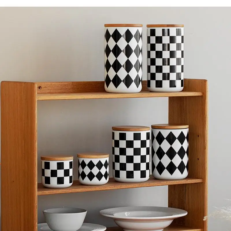 Black and White Checkerboard Sealed Jar Wooden Lid Ceramic Storage Candy Tea Seal Box Cereal Dispenser Kitchen Items