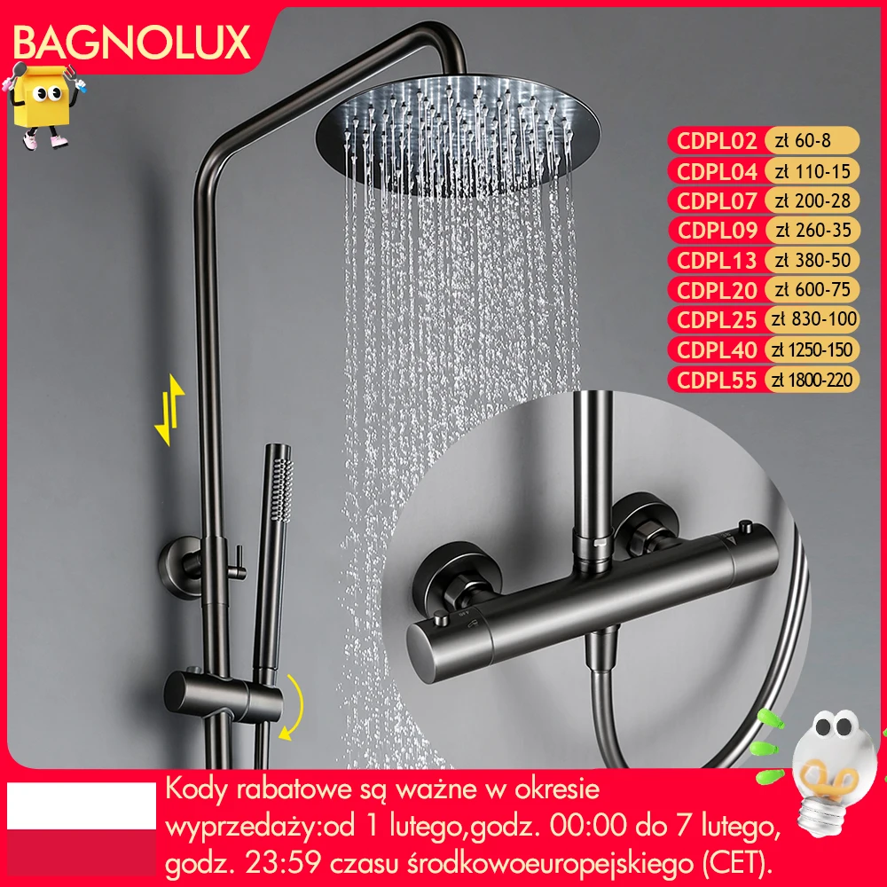 Wall-Mounted Thermostatic Valve System Bagnolux Brushed Gray Brass Rain Faucet 8 - 12" Top Spray Head Bathroom Shower Set
