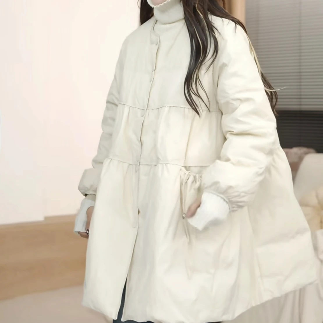 Winter New Arrival Women's Mink-Trimmed Lantern Sleeve Waist-Cinched A-Line Ruffle White Duck Down Jacket Coat