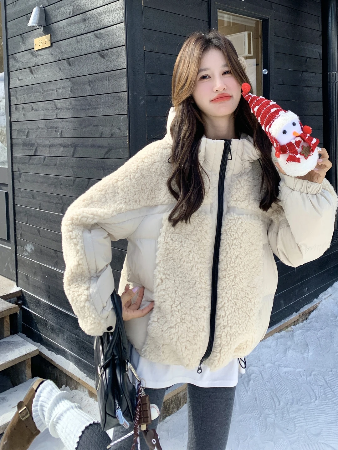 Women's Casual Faion Warm 90% down Jaet Hooded Lamb Fur Patchwork Coat Soft Cozy Woolen Fabric White Du down Outerwear