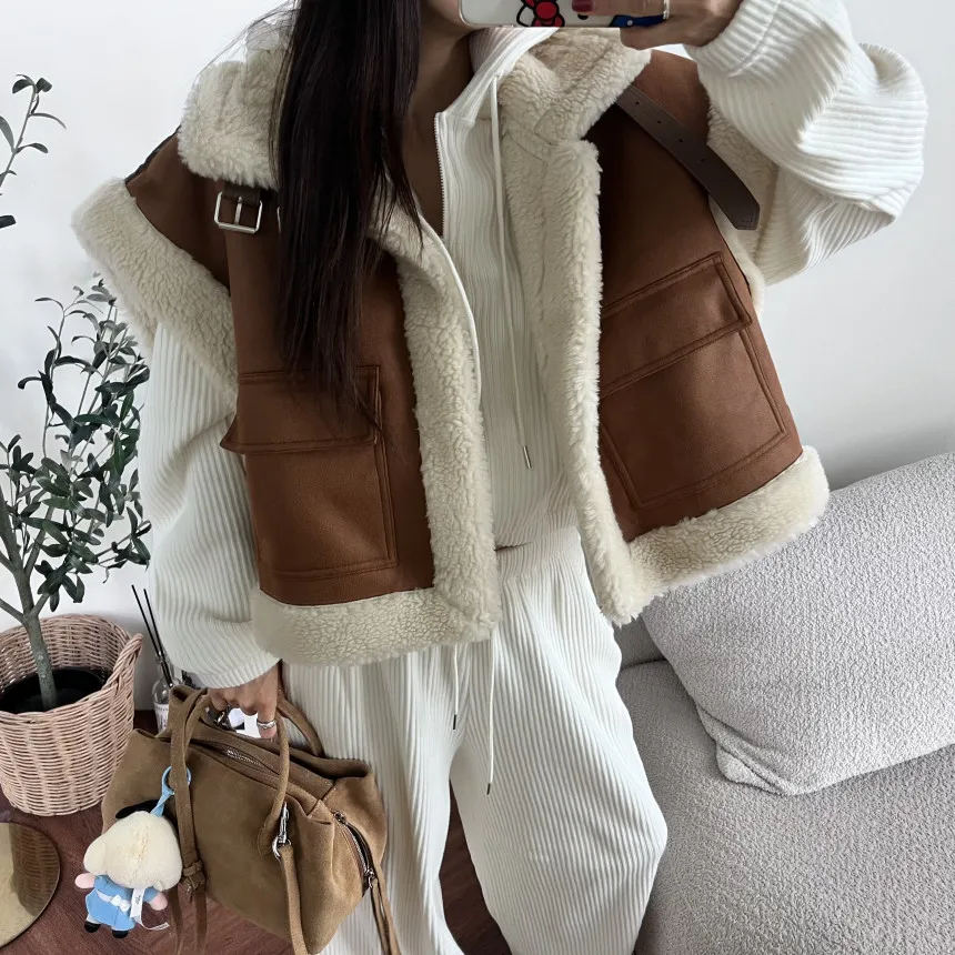 Korean Sle eepskin Leather Svel Coat Women's Faion ort Outerwear Tee-acetate Fiber 00% Versatile All-g
