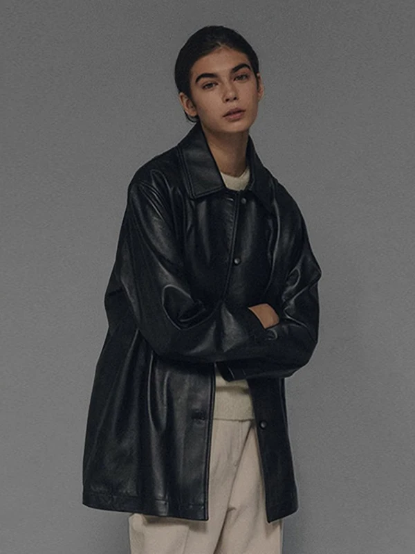 Ele ort Leather Jaet Women's Autumn New Arrival Loose Fit Turn-down Collar Zipper Closure Long Sve Commute Sle