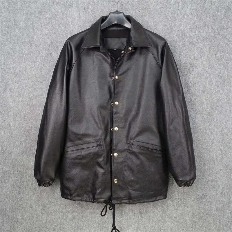 Men's Leather Jaet Top Layer Cowhide Comfortable Fit oulder Insert Design Casual Sle Windproof Long Sve Mid-Length Coat