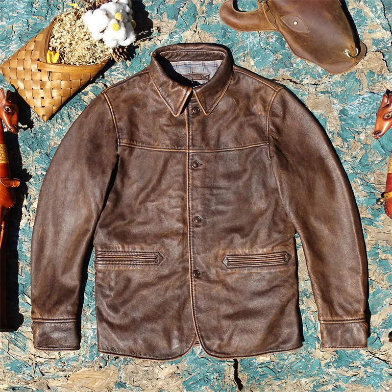 Worn Leather Jaet Men's Mid-Length American Retro Sle Small Calf Skin Genuine Leather Jaet with Color Rubbing And Aged ...