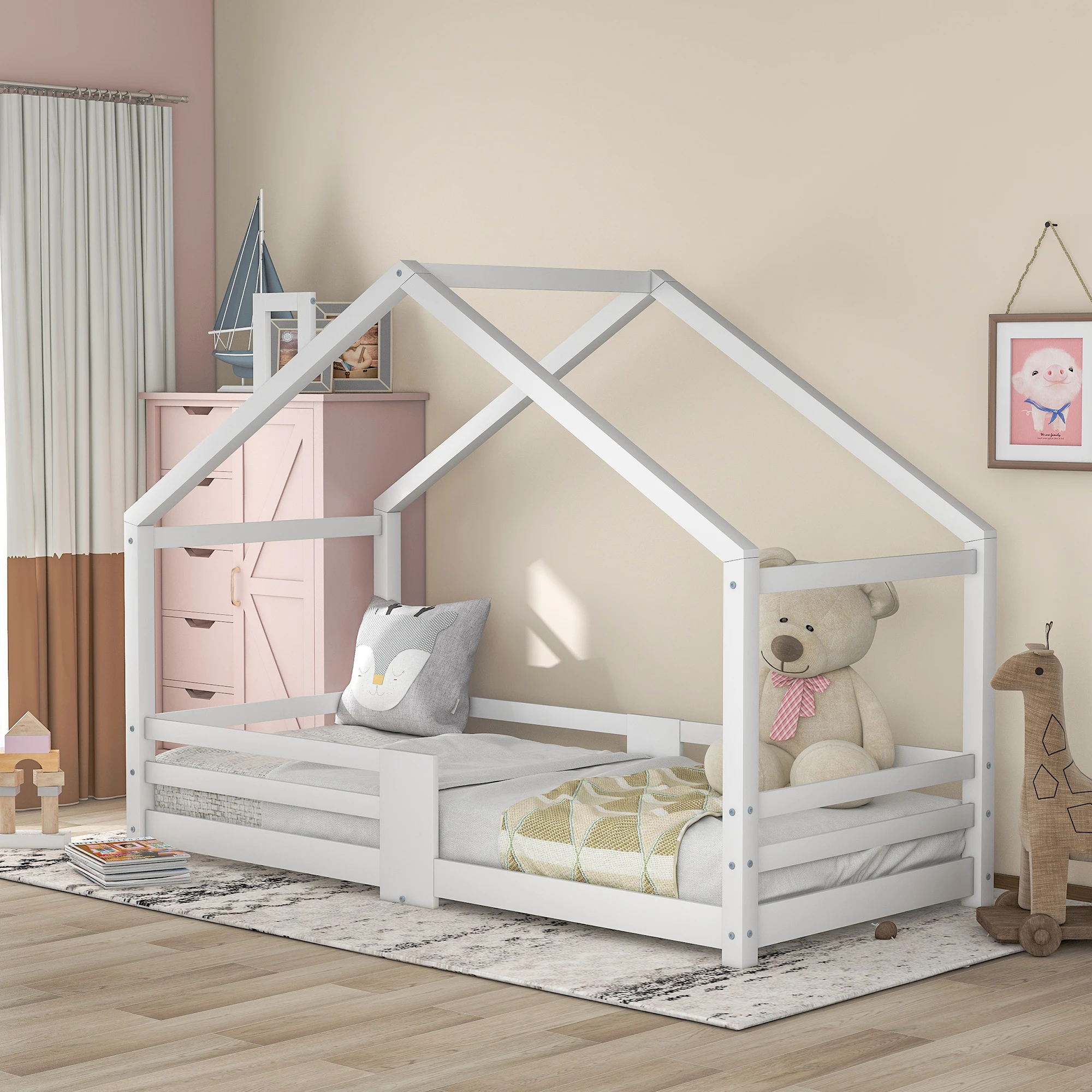 Children bed 90x200 cm in house design with fall protection, pine wood, white, without mattress