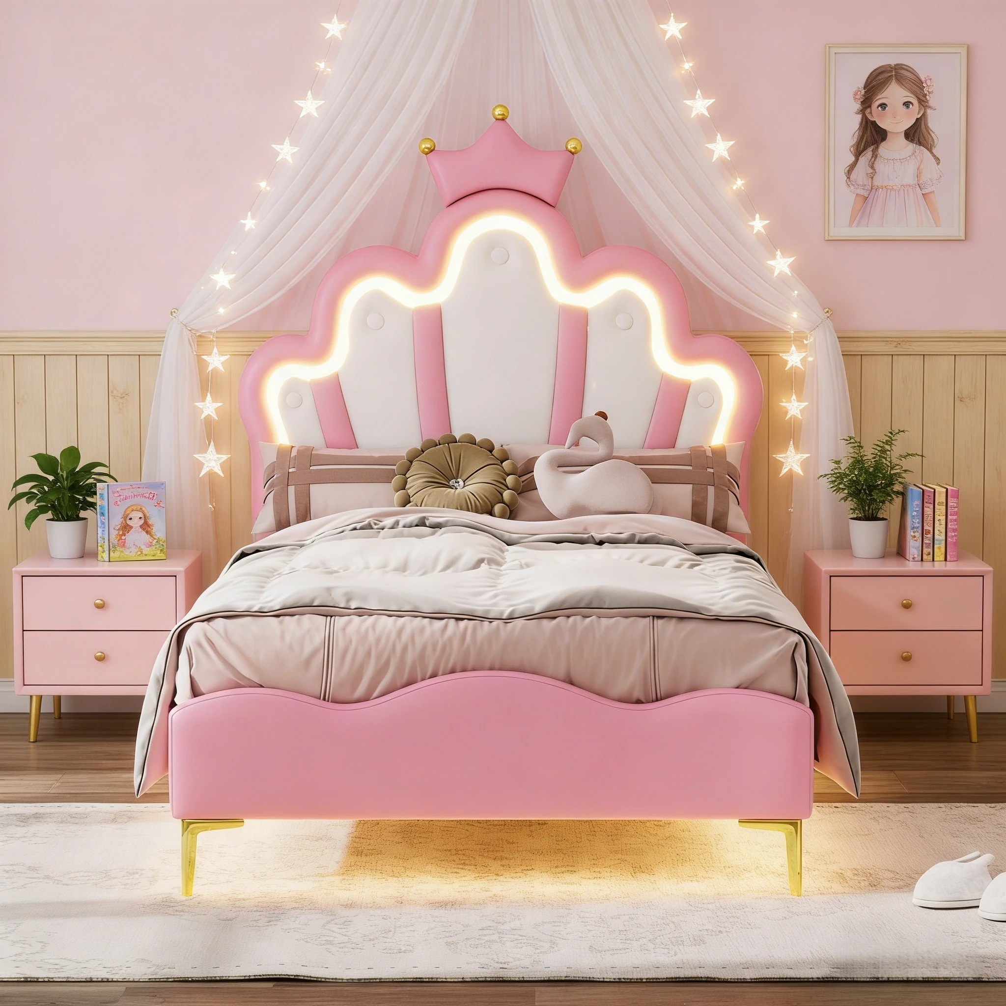 Anajqaqia Children's Upholstered Bed Frame, 90x200cm, Crown-Shaped Princess Bed, with LED Light, Pink