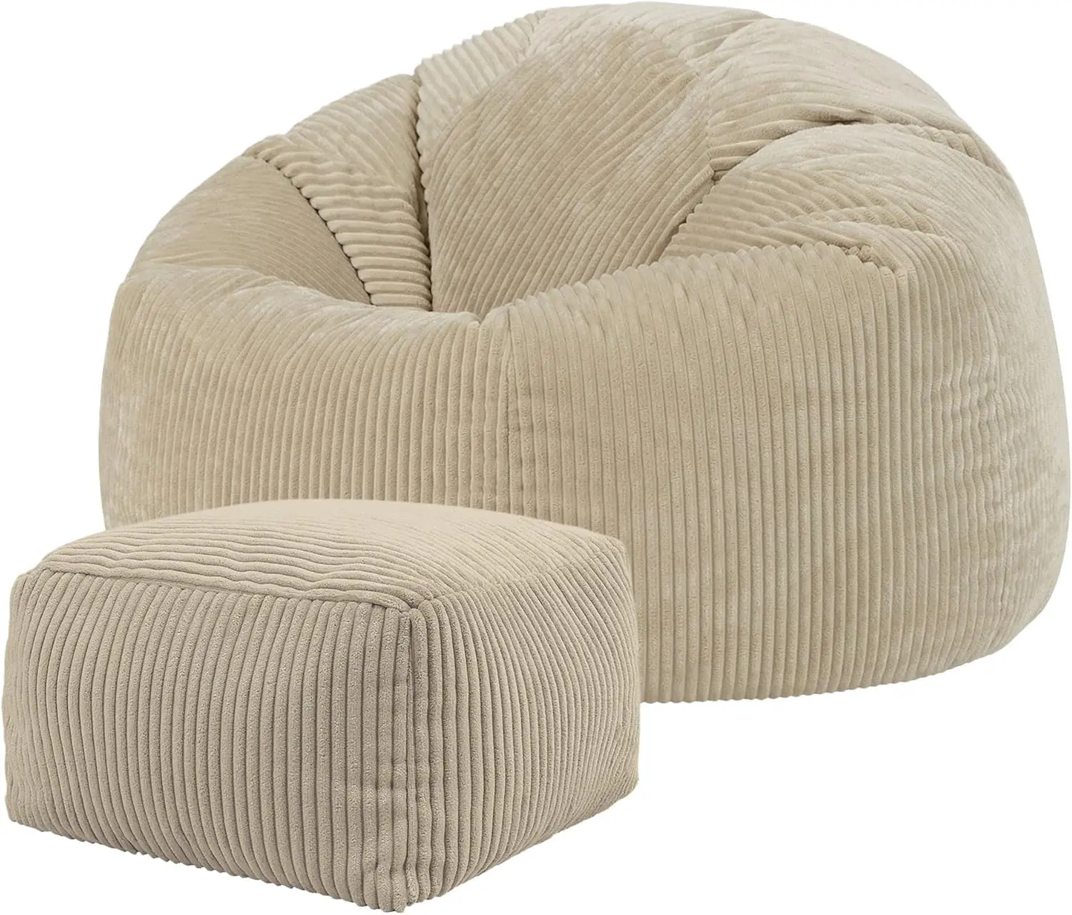 Cord Bean Bag with Footstool, Beige, Large Adult Bean Bag Chair with Filling Included, Comfy Chair, Pouffe Footstool,Living Room