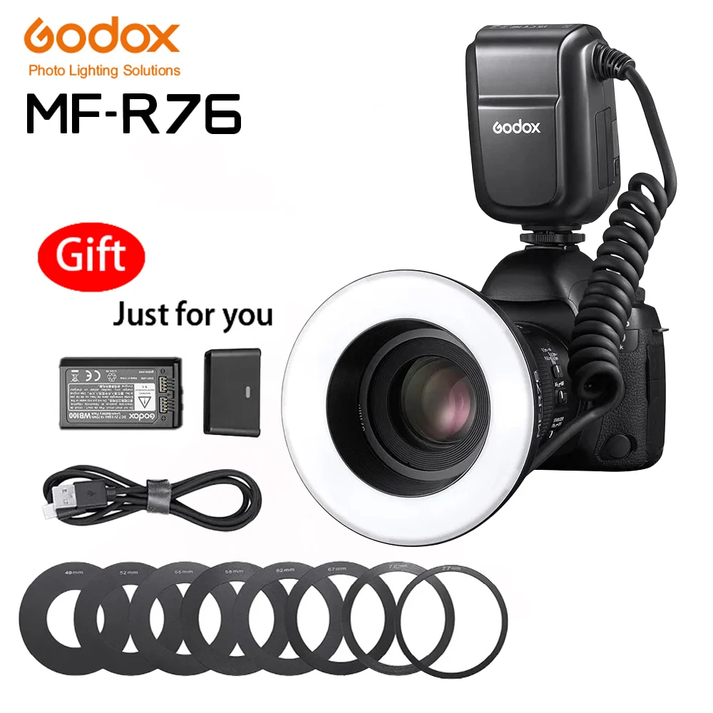 Godox MF-R76 Macro Ring Flash Light + 2600mAh Battery 8 Lens Adapter Rings for Canon Nikon Sony DSLR Camera Close-up Photography