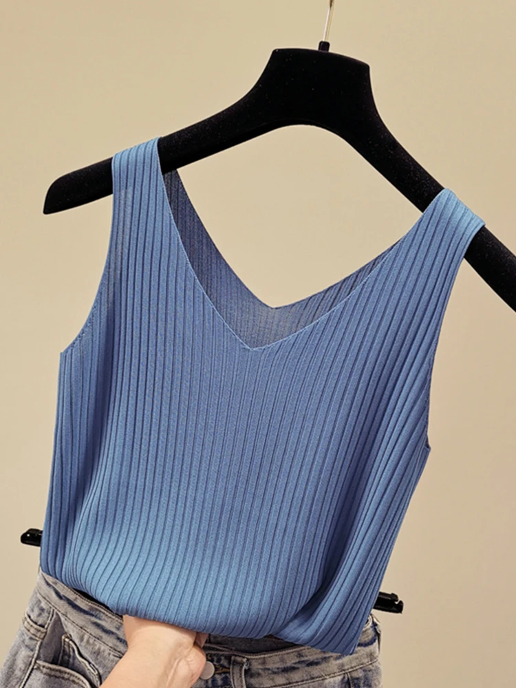 Women's Thin Ice Silk Knitted Sleeveless Top Wide Shoulder Strap Vest Versatile Outerwear Inner Match V-neck Breathable Summe...