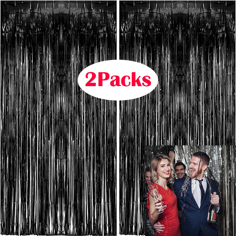 2Packs Black Metallic Tinsel Foil Fringe Curtains Black Fringe Curtain Party Streamer Backdrop Birthday Wedding Party Decoration