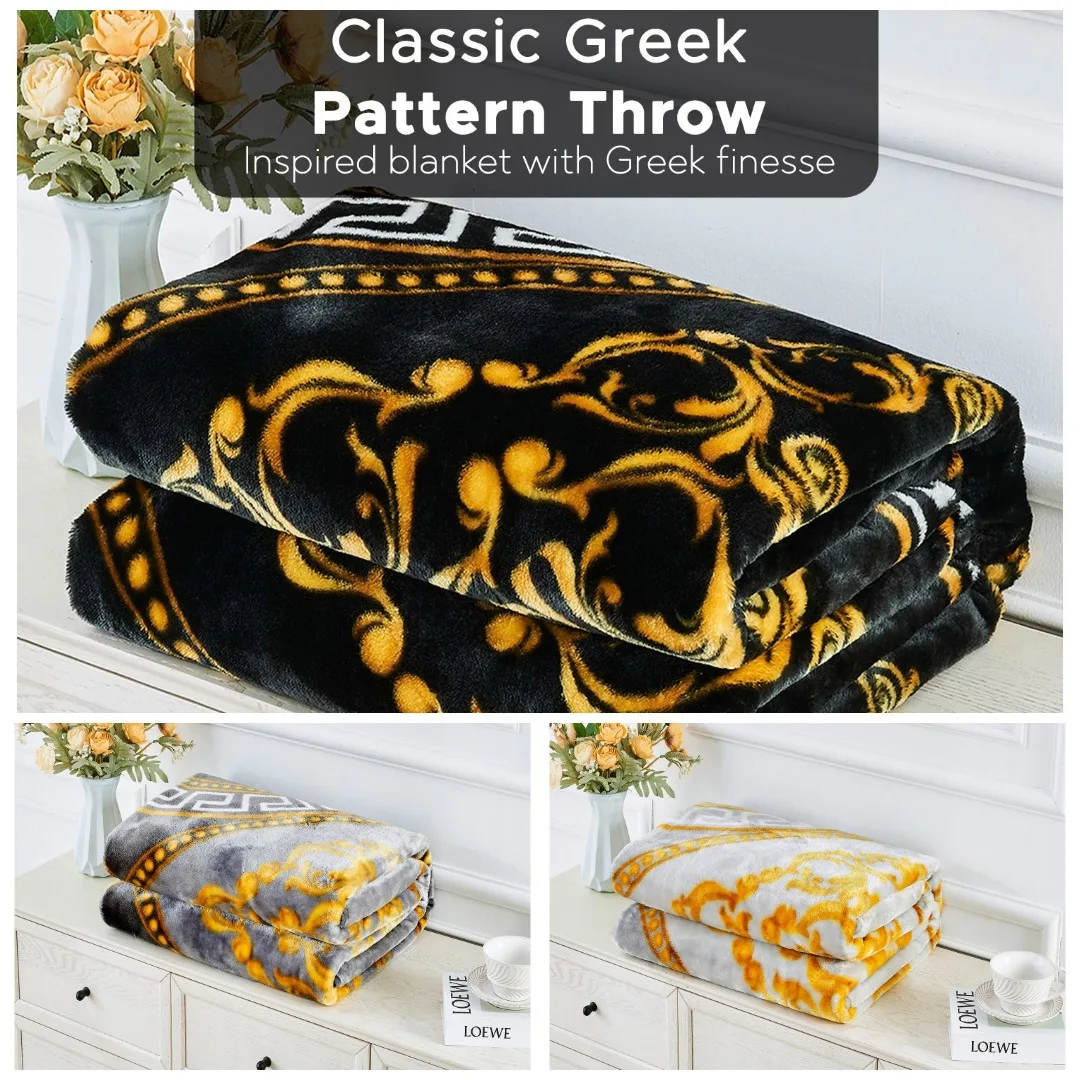 Greek Key Throw Mink Fluffy Fleece Blanket | Plush Velvety Soft Reversible Bed & Sofa Blanket with Elegant Geometric Design | Wa