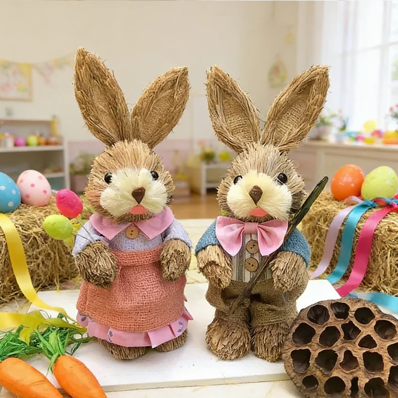 35cm Handwoven Straw Rabbit Statue Easter Bunny Rustic Home Ornament Yard Party Holiday Decor Sculpture for Garden