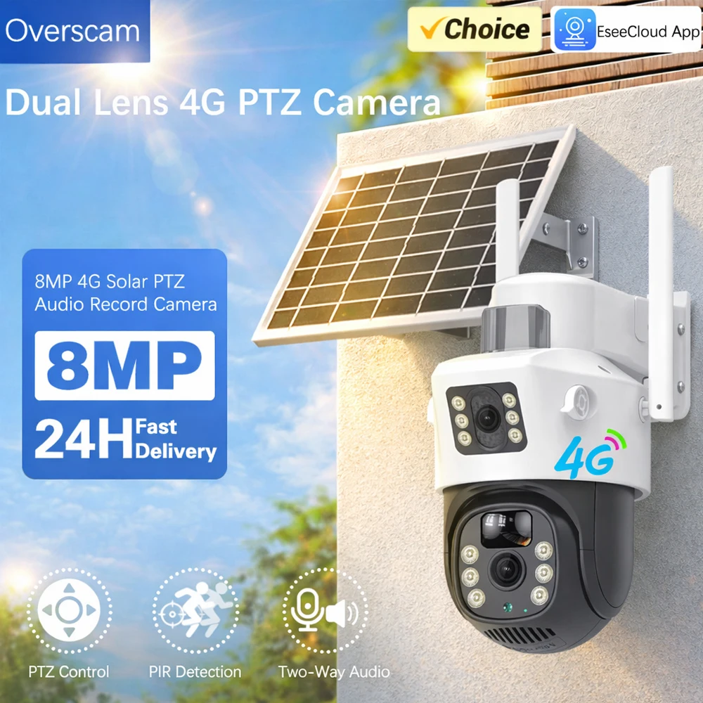 8MP EseeCloud 4G SIM Card Solar Camera 24Hours Video Recording Outdoor Dual Lens Dual Screen PIR Detection Security Surveillance