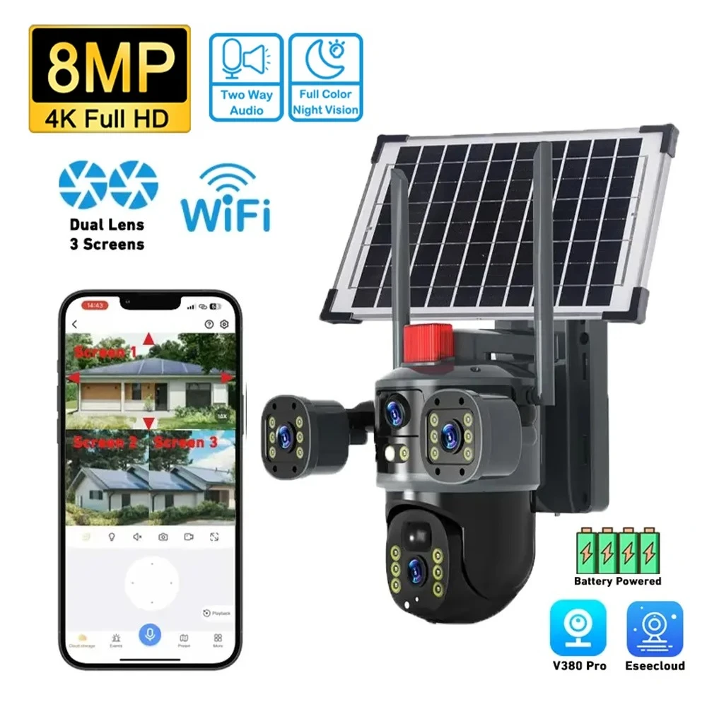 8MP V380 Pro Solar Powered Wireless WiFi Surveillance PTZ Camera 4K Outdoor Security 4G Sim Card Solar CCTV Camera