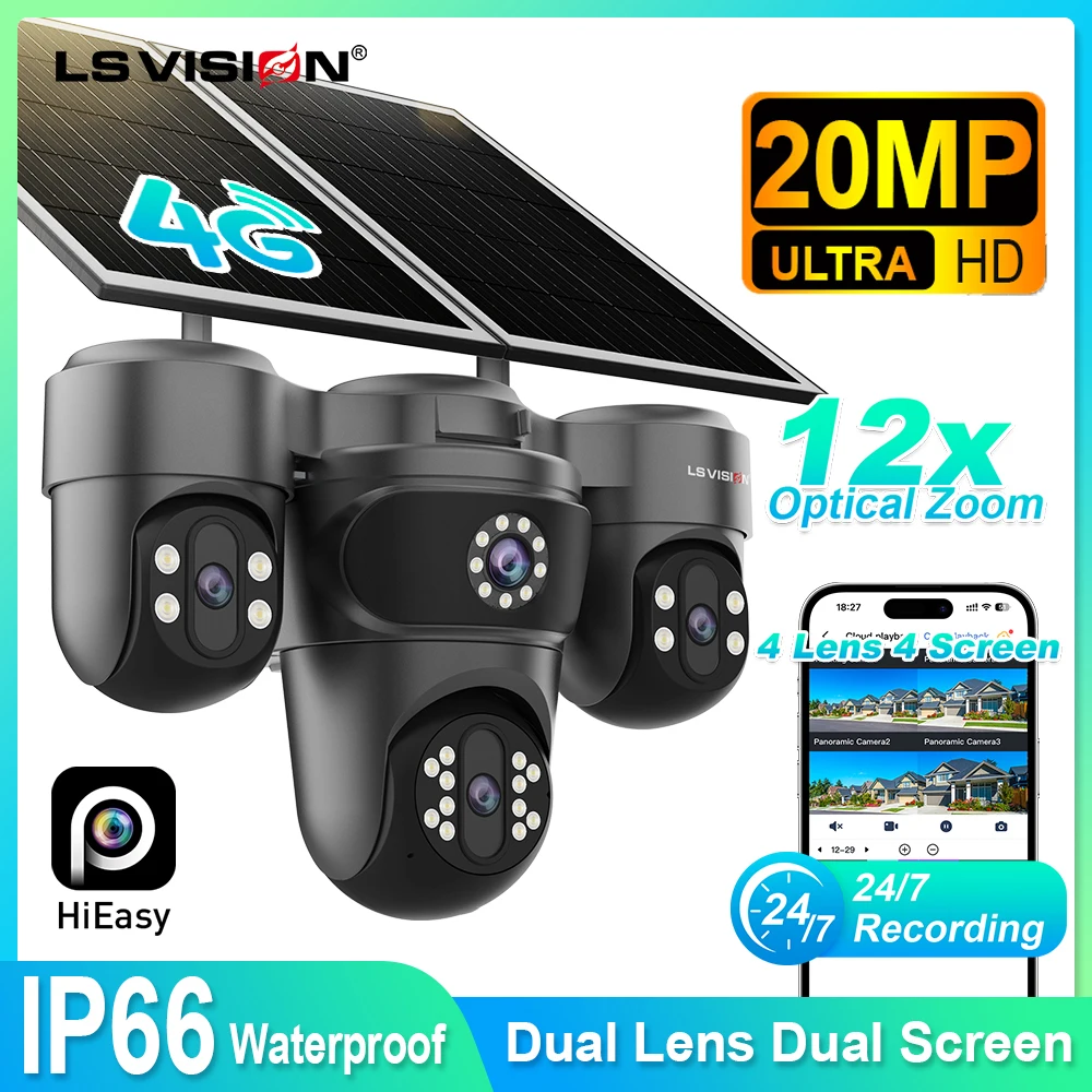 LS VISION 20MP Four Screens 12X Optical Zoom Outdoor Solar Camera 3 PTZ 360 By APP Built-in 14400mAh Batteries CloudSIM 16Wpanel