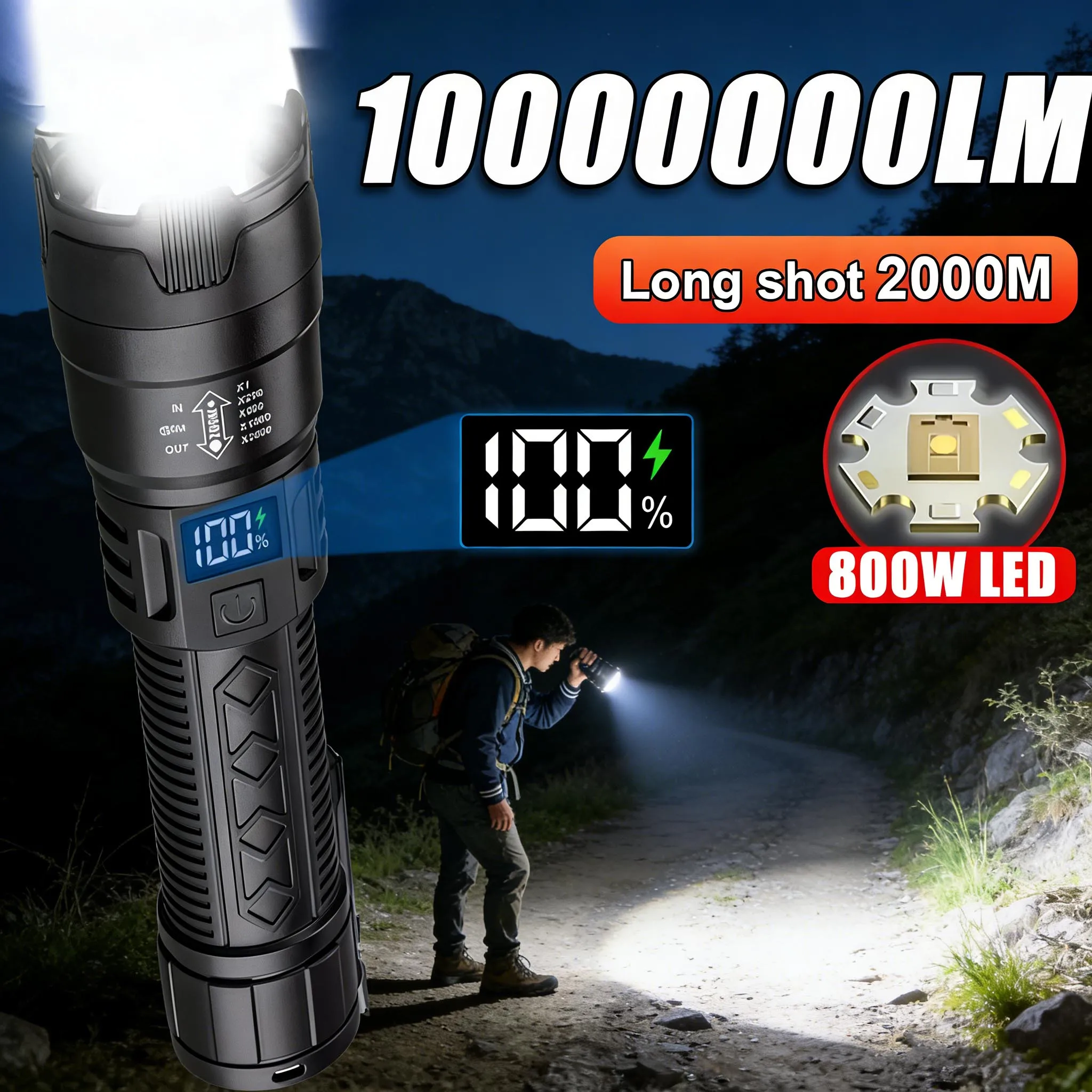 High Power LED Flashlight Long-range TYPE-C Rechargeable Flashlight Power Display Zoom Lantern For Outdoor Camping Torch