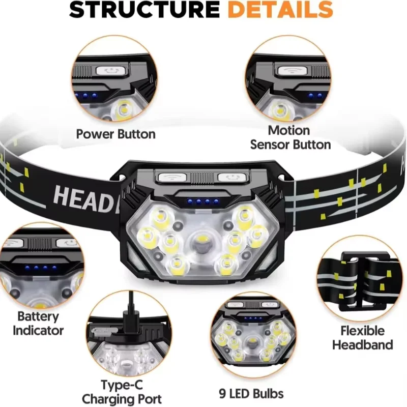 9 Led Strong Light Headlamp USB Rechageable Motion Sensor Headlight Portable Fishing Camping Outdoor Head Lamp Work Flashlight