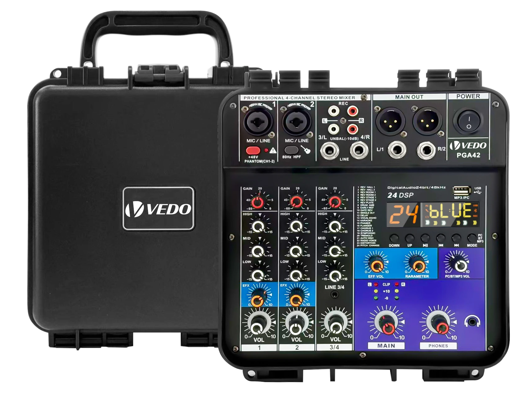 VEDO Professional Amplified Sound Table 4 Channels 2x150W with 24DSP/Bluetooth/EQ Phantom Power + 48V Bivolt