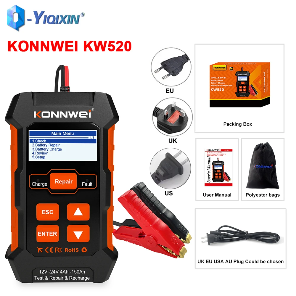 KONNWEI KW520 Battery Tester Charger 12V 24V Voltage Testing Car Truck Battery Repair Tool 100-2000CCA Automotive Battery Tool