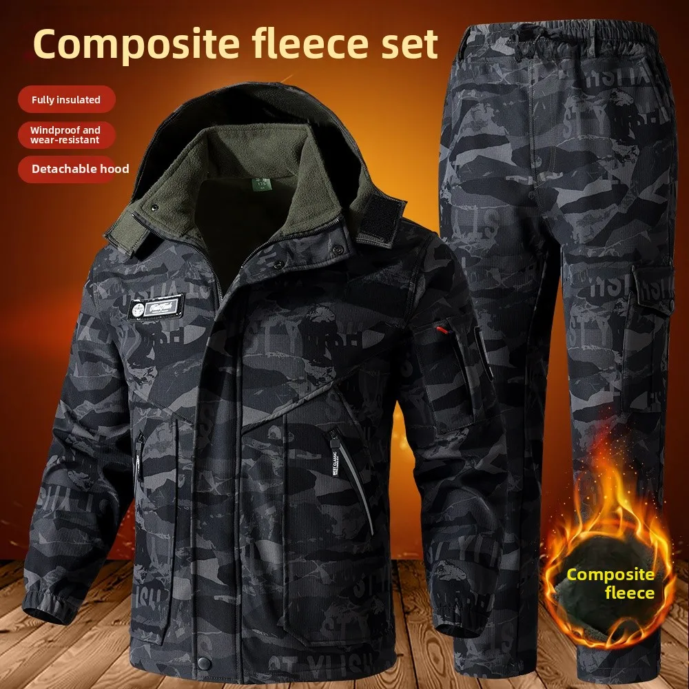 Thickened Fleece Autumn Winter Workwear Suit for Men Outdoor Windproof Waterproof Coldproof Warmth Factory Work Uniform Set