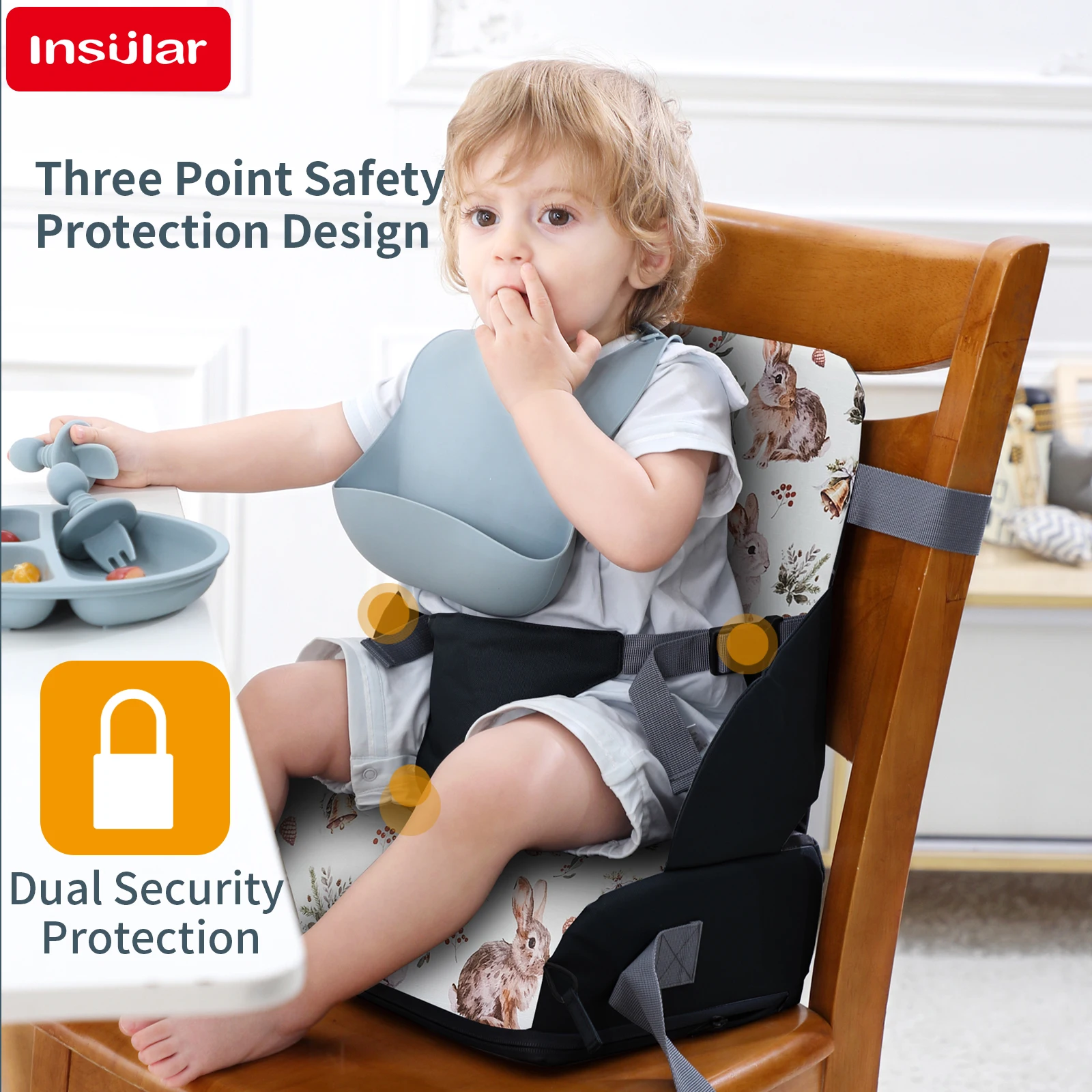 INSULAR Baby Booster Seat + Diaper Bag Convenient Travel Toddler Cushion Kid Chair Washable Straps Safety Buckle Muti-functional