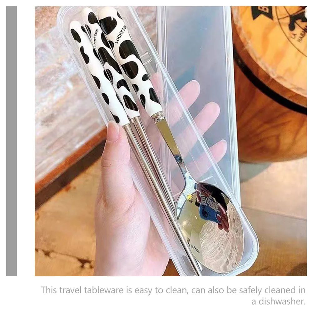 1Set Cartoon Cow Portable Silverware Kit Travel Utensils Durable Reusable Camping Utensils Set Fork Spoon Chopsticks