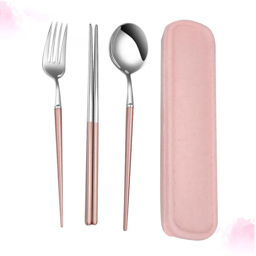 3Pcs Food Safe 304 Stainless Steel Spoon Chopsticks Utensils Set Portable Flatware Kit with Carry Case for Travel Camping Car