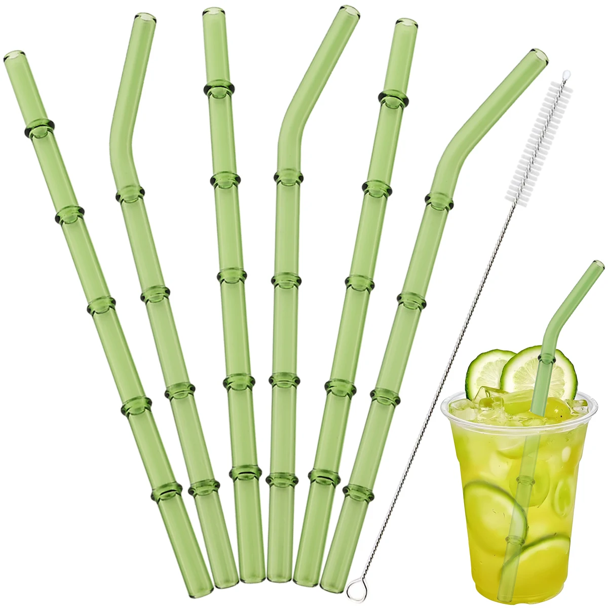 4/6/8pcs Reusable Glass Straw with Brush Green Bamboo-shaped Straws Set Suitable for Milkshakes Juices Coffee Bar Accessories