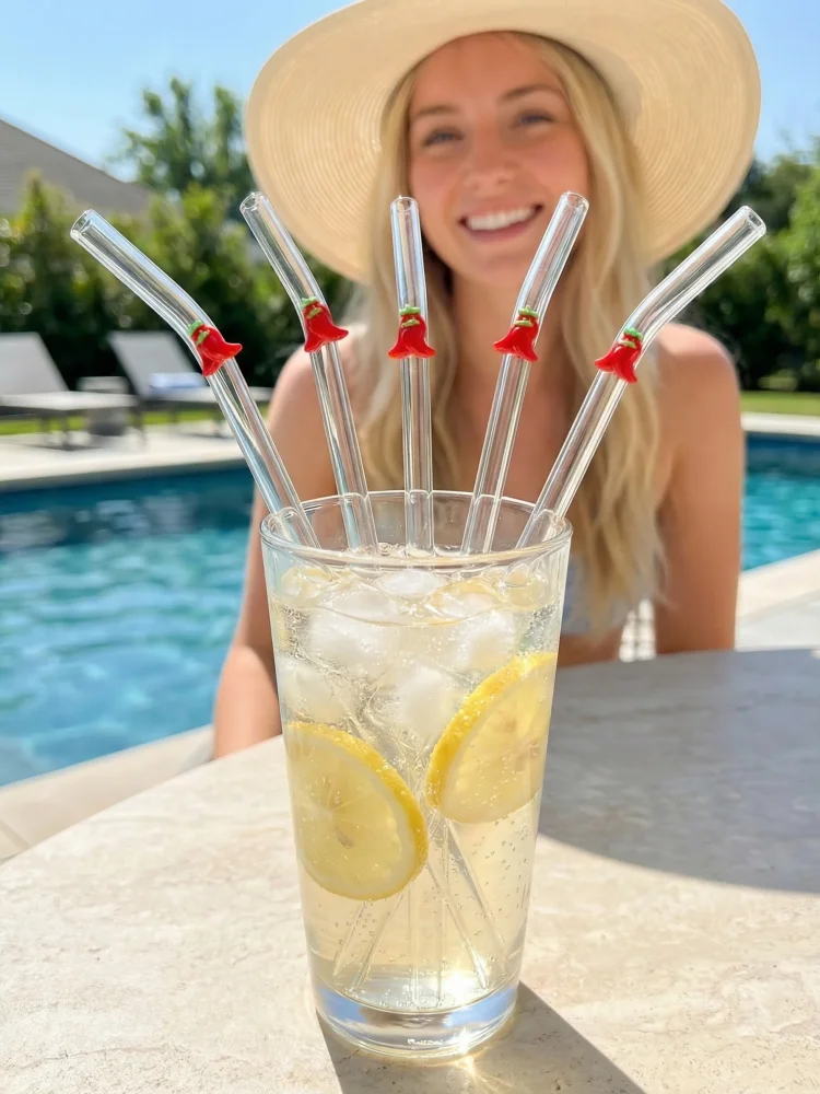 Reusable Curved Glass Straws with Chili Decor,Easy Clean. Perfect for Iced Drinks,Pool Party, Wedding, Bachelorette, Beach