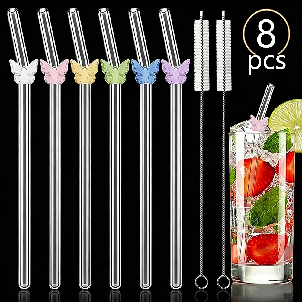 2/6PCS Elegant Butterfly-Shaped Glass Straws &, Reusable Drinkware for Bubble Tea, Juice, Soda, Smoothies, with Cleaning Brush