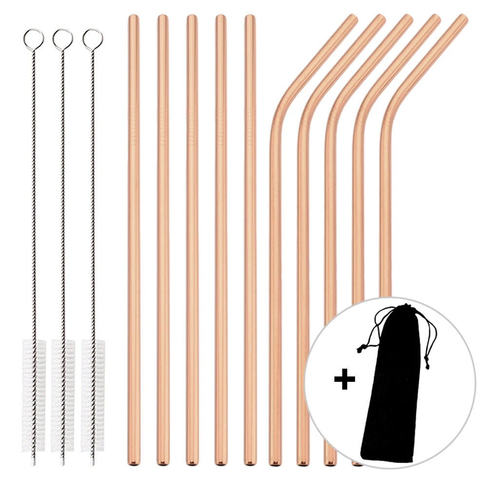 14Pcs Reusable Rose Gold Straw Set 304 Stainless Steel Straw Straight Bent Drinking Straw With Cleaning Brush Home Bar Accessory