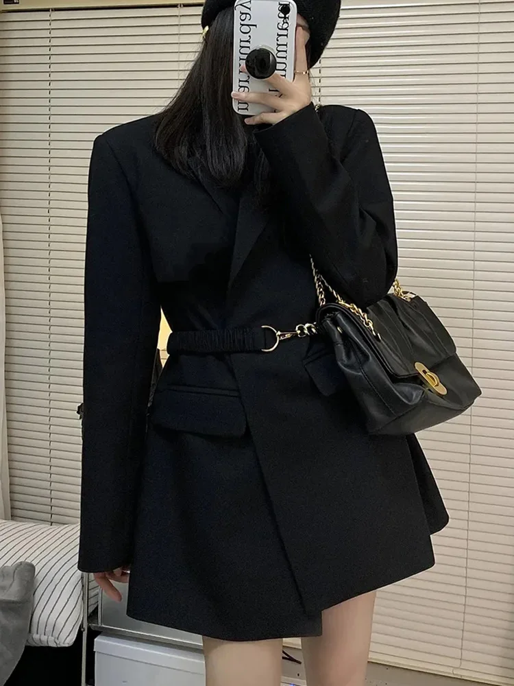 Vintage Elegant Black Blazer Women Sweet Long Sleeve Belt Slim Suit Coat Korean Spring New Retro Female Casual Chains Jacket Top