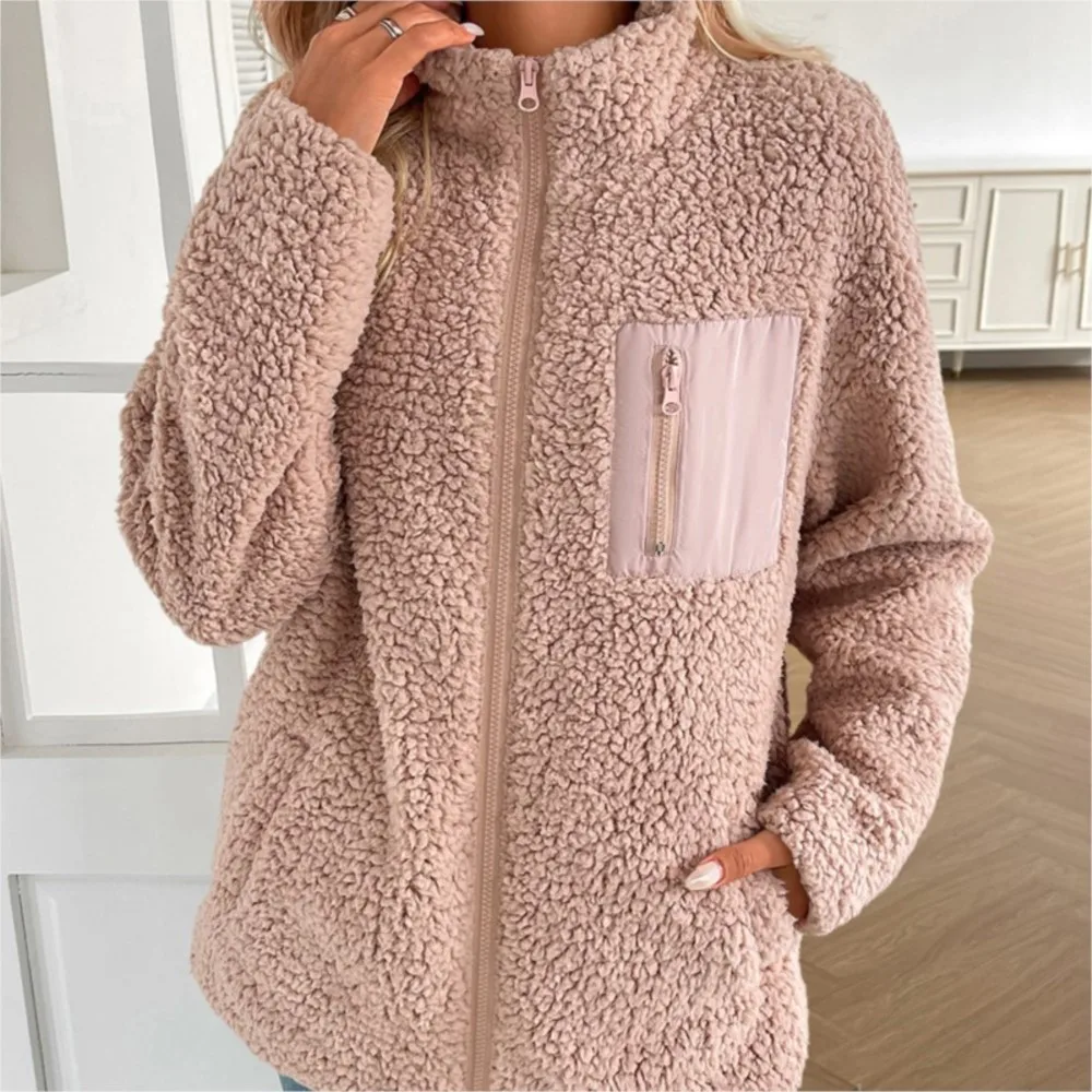Women's Winter Warm Plush Jacket Casual Heart-shaped Pattern Zipper Cardigan Coat Ladies Fashion Flip Collar Fleece Outerwears