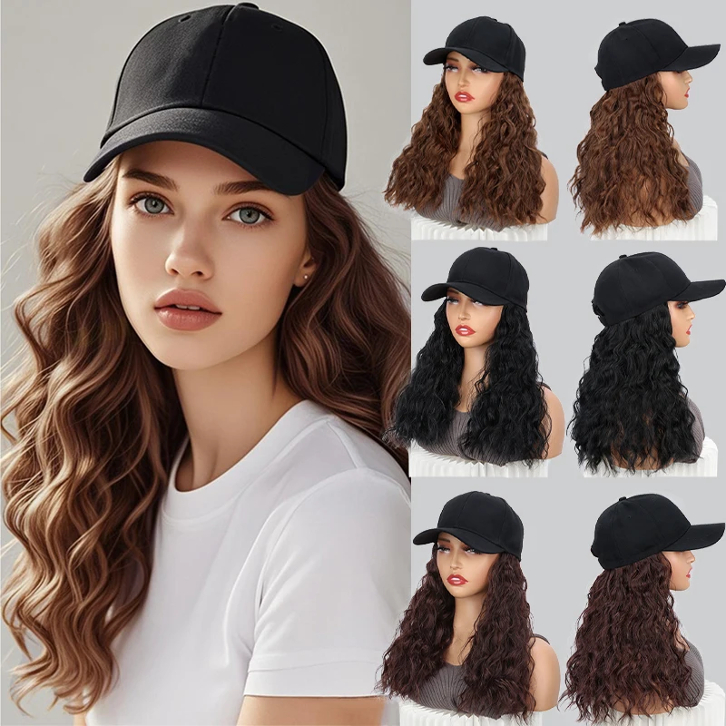 20Inch Synthetic Long Curly Baseball Cap Hat Wigs Heat Resistrant Black Brown Hairpiece for Women