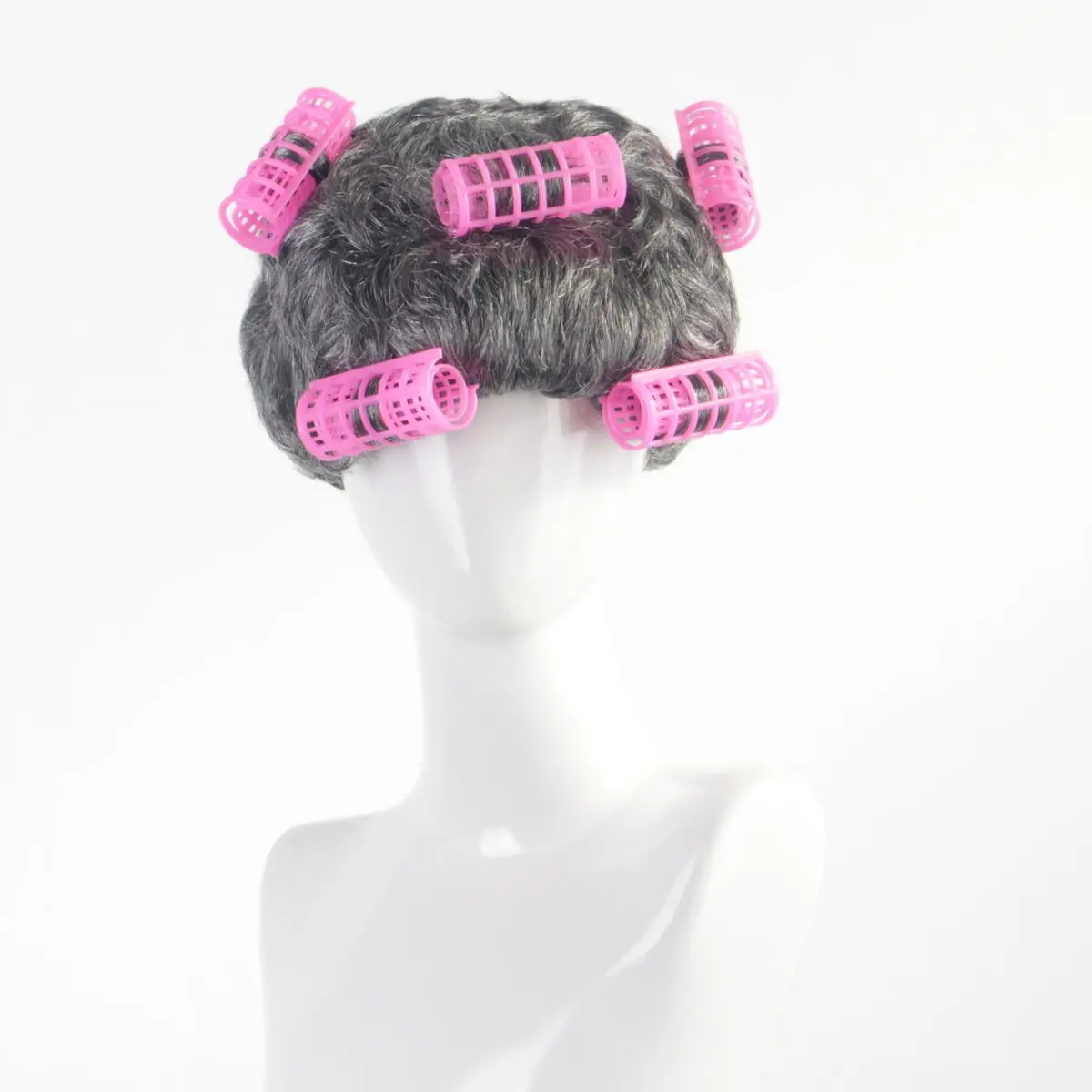 Anxin Brand Synthetic Wig, Gray-Black Short Curly Hairstyle, Decorated with Pink Curlers, Fluffy Texture Hair, Suitable for Quirky Parties/Retro Styling/Comedy Cosplay, for Trendy and Creative Wearers Aged 16+, Easy to Wear and Detachable Decoration, One-Piece Set
