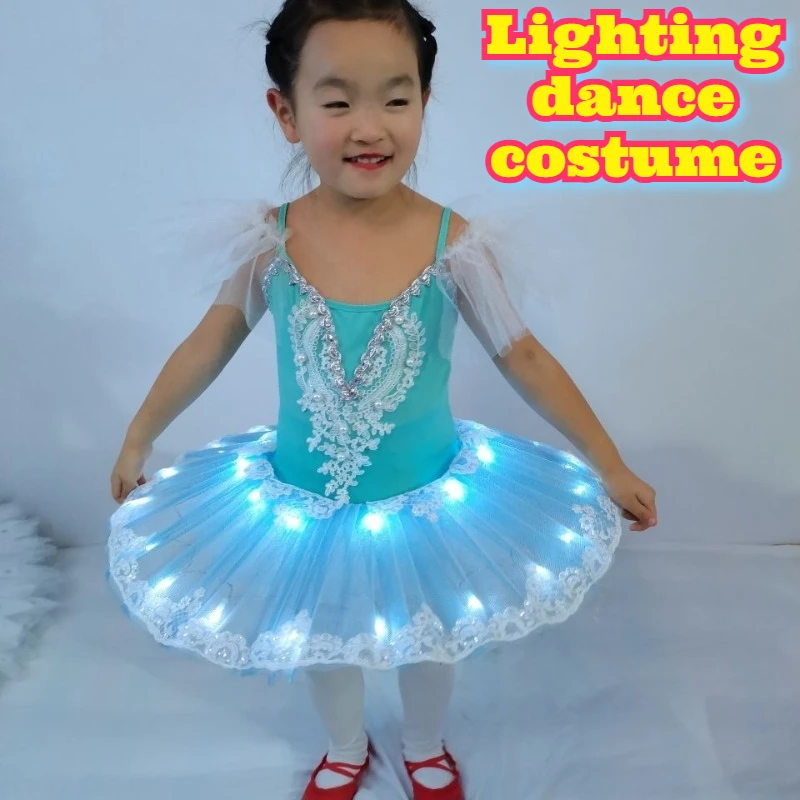 Blue Glowing Ballet Tutu Skirt Dance Performance Sparkly Swan Lake Stage Costume Beginner Ballerina Outfit LED Light Up Strappy