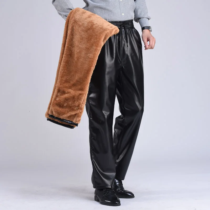 Men's Winter Thiened Fce Lined Leather Pants Motorcycle Riding Outdoor Windproof Waterproof Warm Loose Cotton Trousers