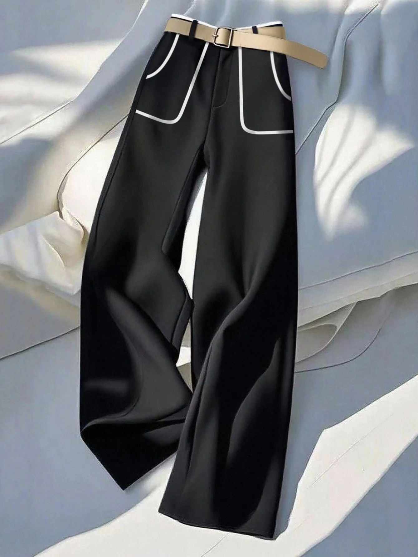 Women's Black High Waist Wide Leg Pants | 2026 New Contrast Piping Pocket Draped Flattering Casual Suit Trousers