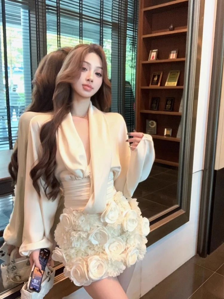 Casual Solid Color Chiffon Commute Two Piece Sets Elegant Loose Outfits for Women Sexy V-neck Lace Up Tops & Long Skirts Sets