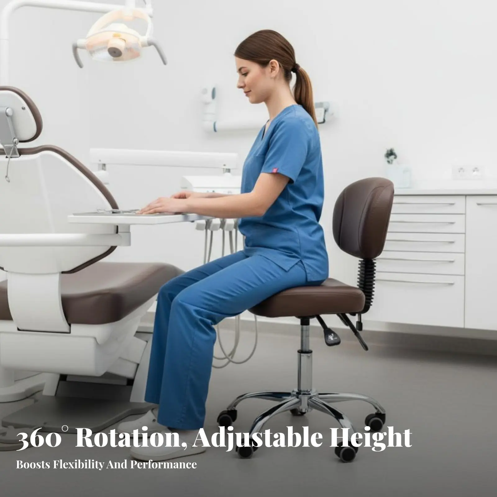 Dental Assistant Chair with Torso Support Height-Adjustable Professional Seating 360-Degree rotate effortlessRolling Casters