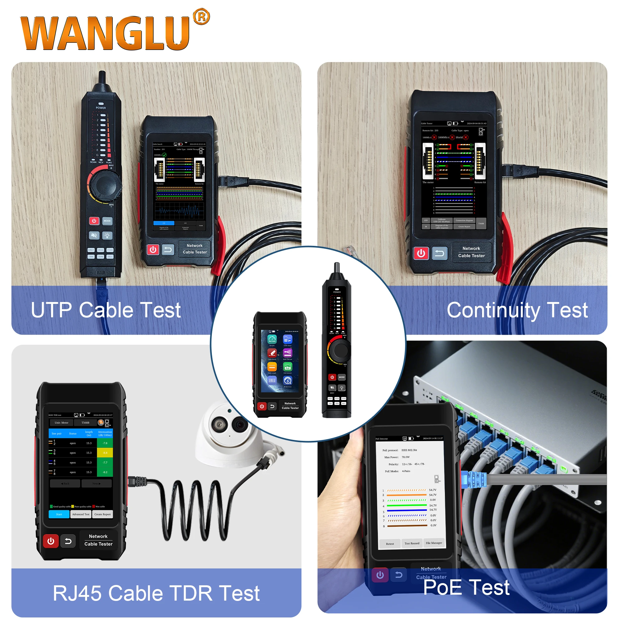 WANGLU Touch Screen UTP Tester RJ45 Network Cable Tester PoE IP Search Scan Tracer Short Circuit Test in one Network Tool Kit