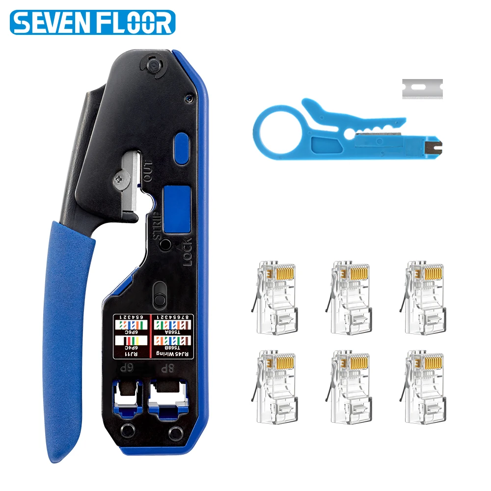RJ45 Crimp Tool Pass Through Ethernet Crimping Tool for Cat6 Cat5 Cat5e RJ45 Connectors with Replacement Blade Stripper Cutter