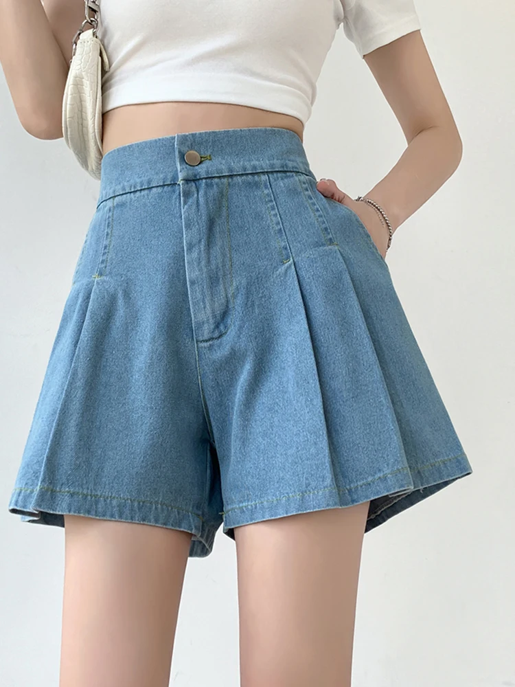 2025 Summer Plus Size Denim Shorts Skirts Women Loose Casual Wide Leg Jeans Short Pants Femme High Waisted Pleated Shorts Woman