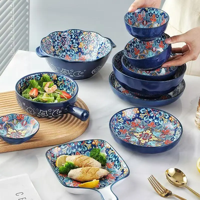 Bohemia Ceramic Rice Bowl Serving Plate Creative Ceramic Cutlery Soup Noodle Bowl Household Handle Bowl Sauce Dish