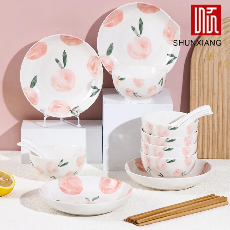 SHUNXIANG 22pcs Ceramic Dinnerware Set Home High Temperature Underglaze Color Rice Bowls& Chopsticks Spoons Dishwasher Safe