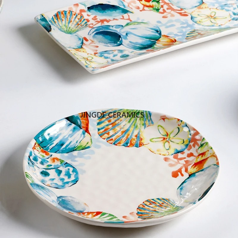 1pc Ocean Style Ceramic Tableware Underglaze Color Rice Lamian Noodles Dividing Bowl Main Course, Stir Fry Dish Kitchen Utensils